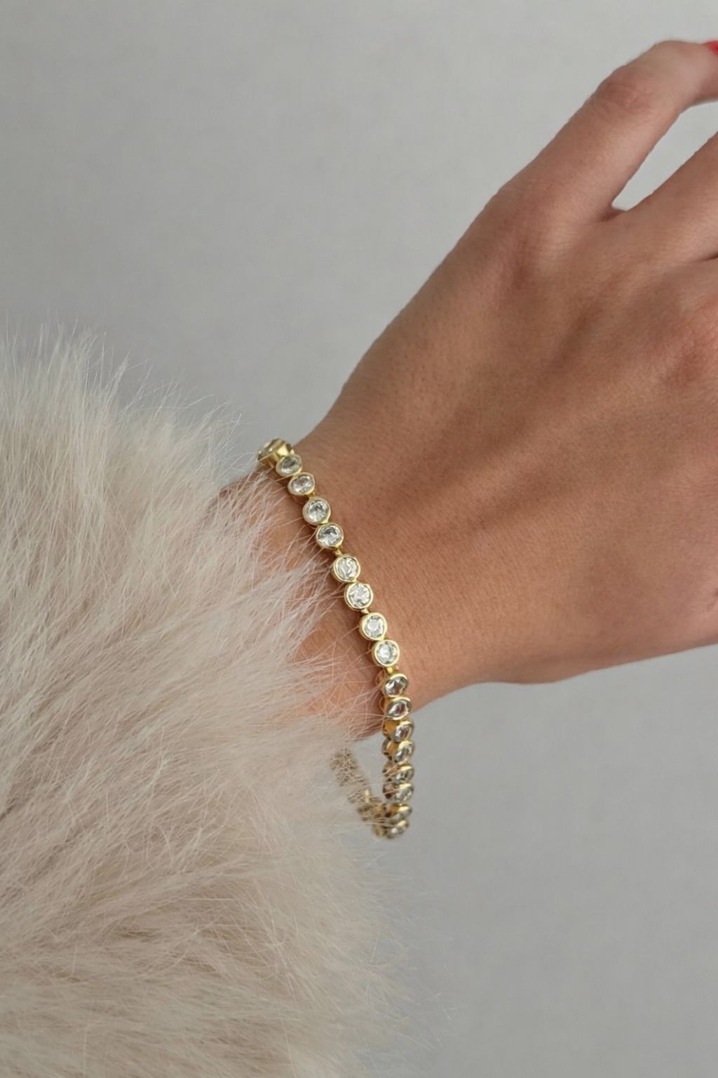 Göz alıcı taşları, bilekliğin zarif yapısı ile bir araya gelerek, eşsiz bir parıltı oluşturur. Taşların düzenlemesi, özenle yapılmış olup, her biri farklı bir ışık yansıması sunarak bilekliğin şıklığını artırır.