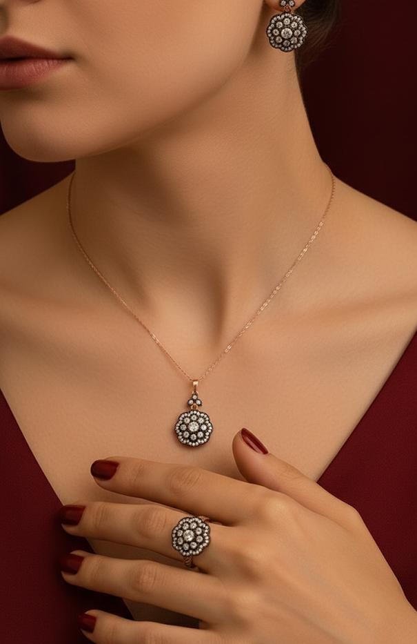 925 Ayar Gümüş Elmas Montürlü Çiçek Motifli Takı Seti