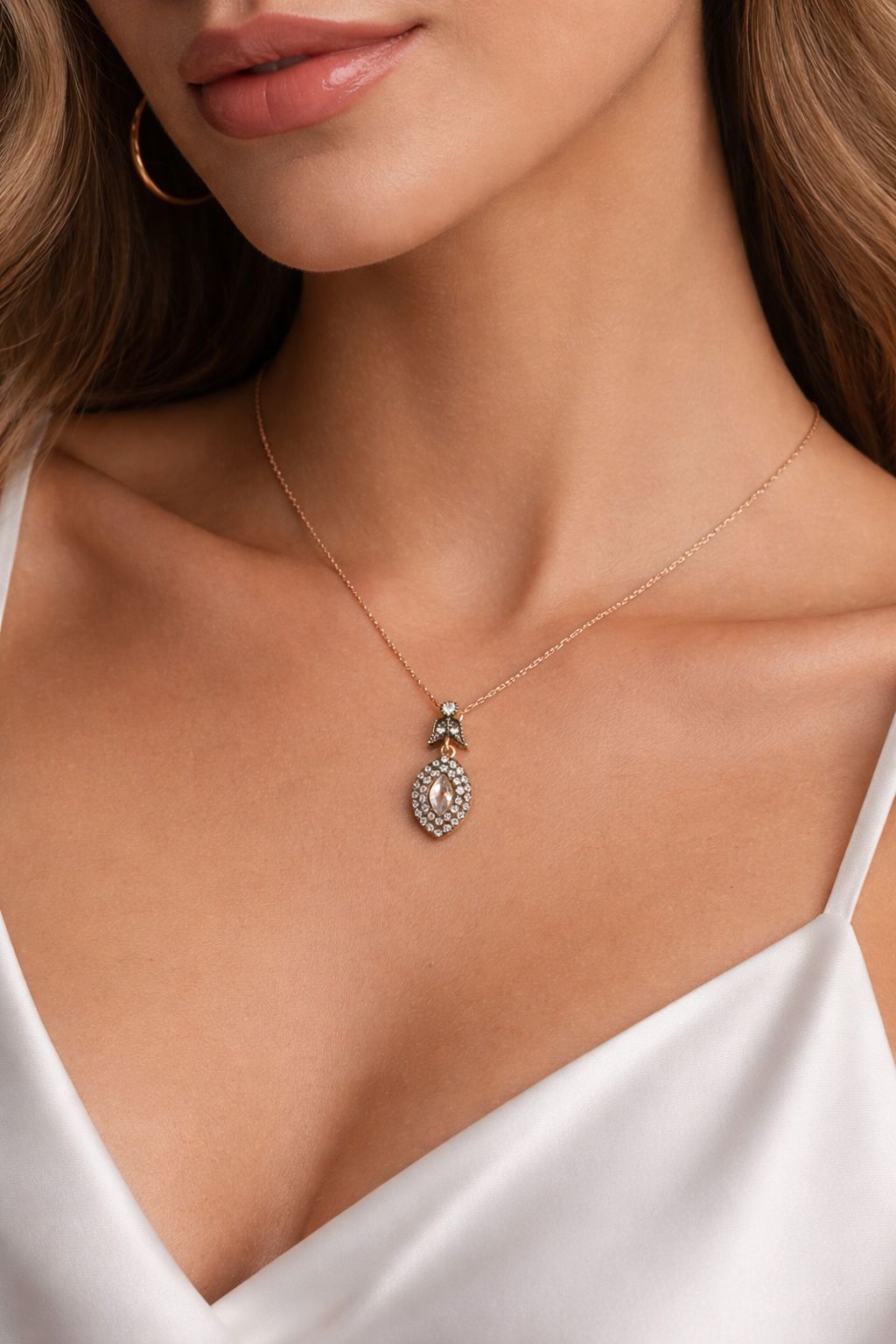 Setin en dikkat çekici parçalarından biri olan kolye, modern tasarımı ile her türlü elbisenizle uyum sağlar. Damla formu, boyun çizgisine zarif bir şekilde otururken, elmas montürler sayesinde ışıltısı ile göz alıcı bir etki yaratır.