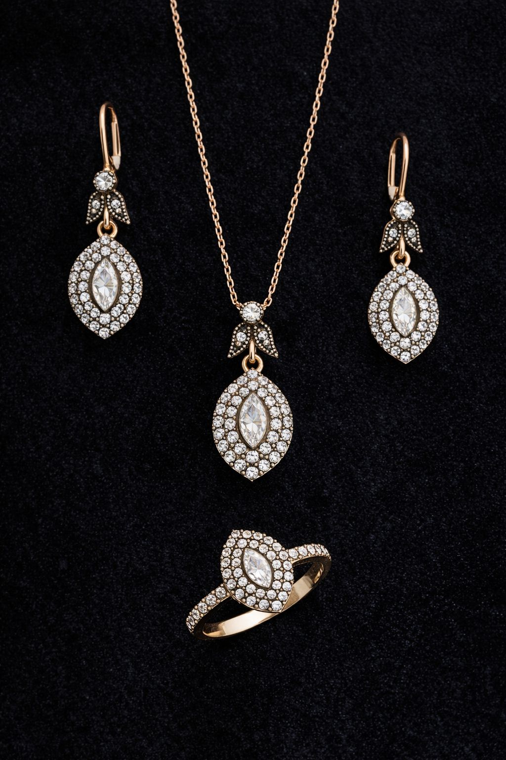 925 Ayar Gümüş Elmas Montürlü Damla Set – Kolye, Küpe ve Yüzük Takımı