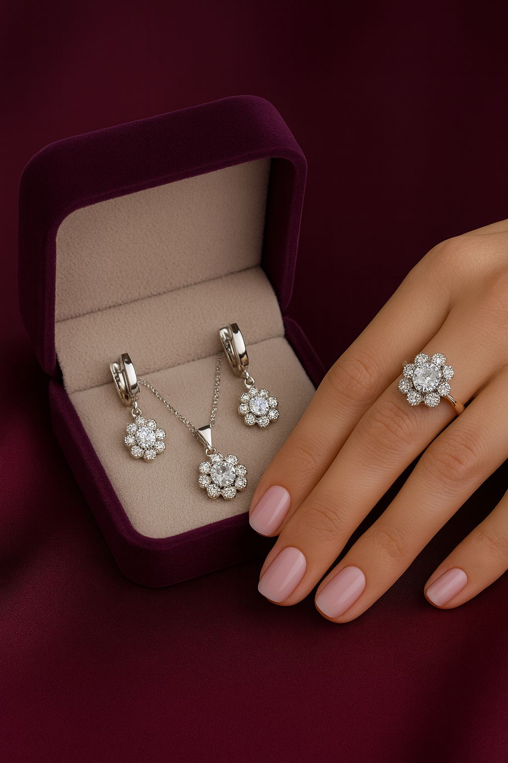925 Ayar Gümüş Yuvarlak Kesim Zarif Takı Seti — Kolye, Küpe ve Yüzük