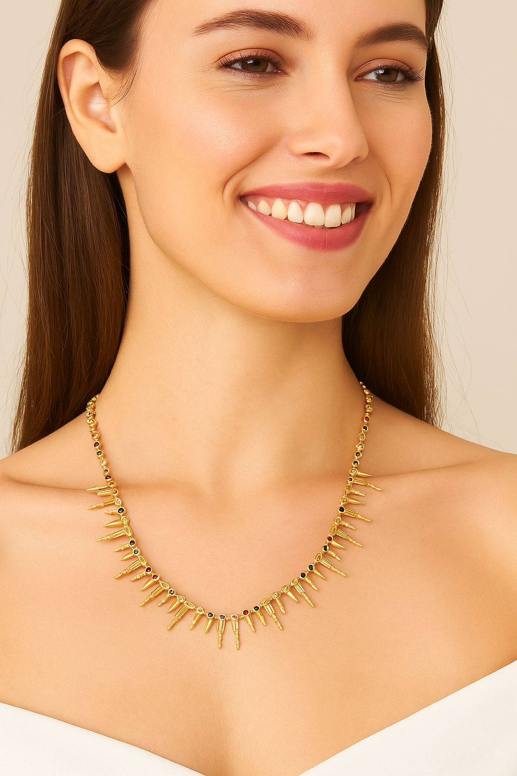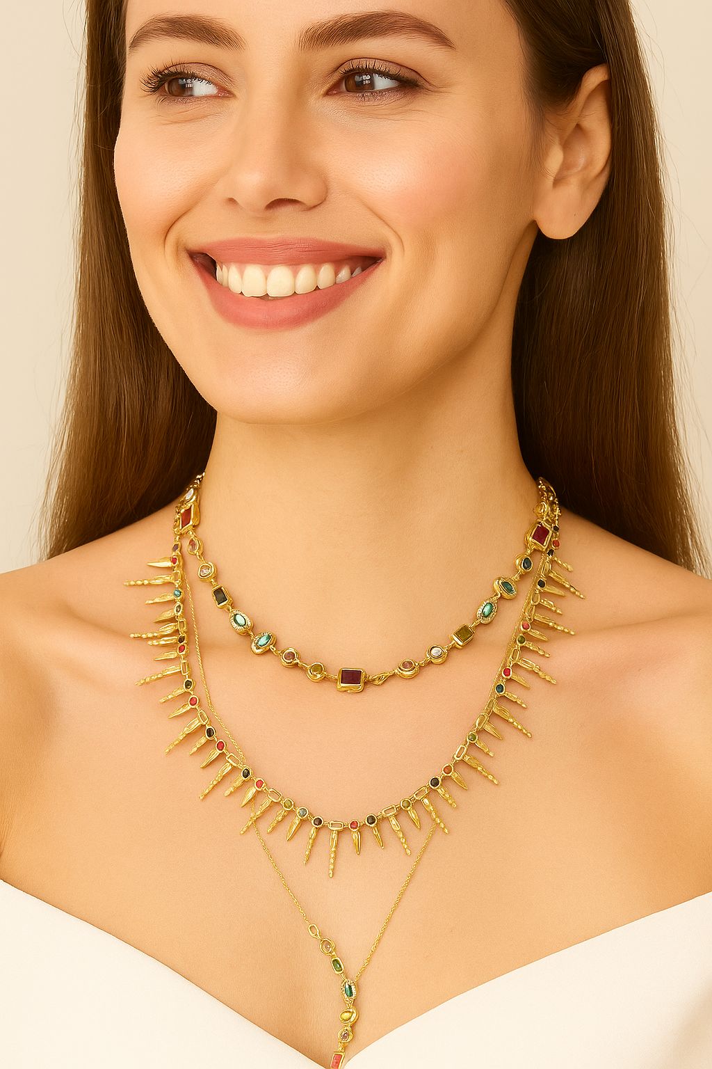 Altın Renkli Çok Renkli Taşlı Zarif Uç Detaylı Kolye