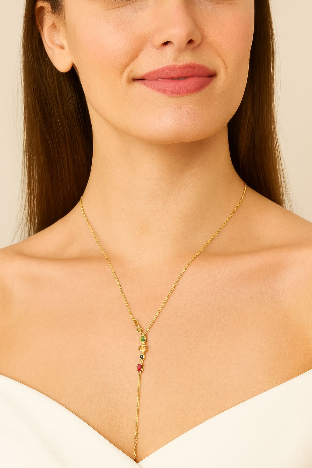 Altın Zincirli Renkli Taşlı Uzun Kolye