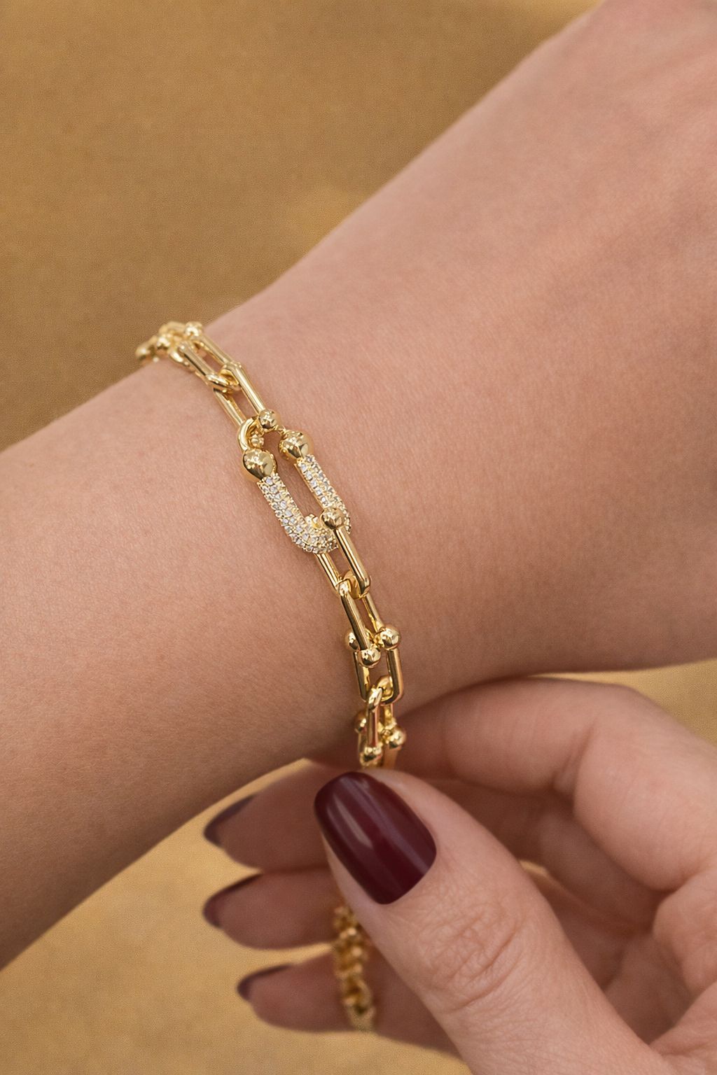 Bilekliğin özel ataç detayları, modern tasarım anlayışının bir yansıması olarak dikkat çekmektedir. Her bir ataç tek tek işlenmiş ve yüksek kalite taşlarla süslenmiştir. Bu detaylar, bilekliğin hem günlük kullanıma hem de özel günlere uygun olmasını sağlar.