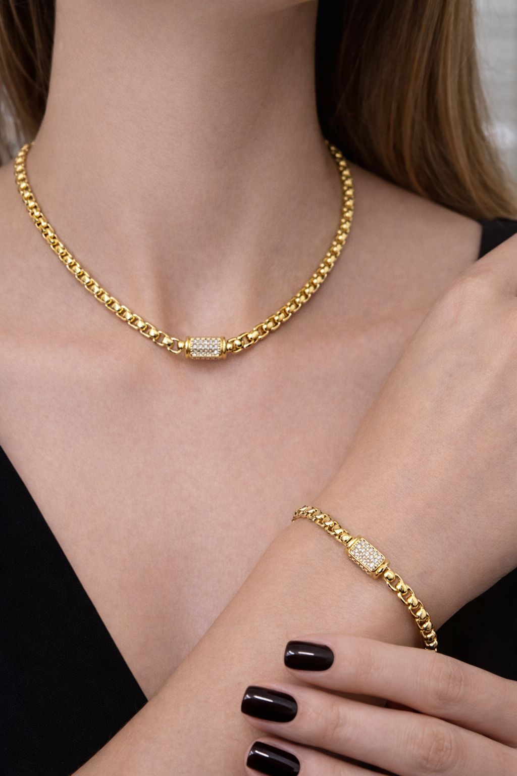 Aurielle Royale Kolye ve Bileklik Seti, zarif tasarımı ile öne çıkmaktadır. Kolye, dikkat çekici bir askı biçimi ile tasarlanmış olup, boyuna şıklık katmaktadır. Bileklik ise aynı zarif detayları taşır ve bilek çevresinde parıldayan taşlarıyla göz alıcı bir görünüm sunar. Hem günlük hem de özel günlerde kullanıma uygun olan bu set, her türlü kıyafeti tamamlayacak şekilde tasarlanmıştır.