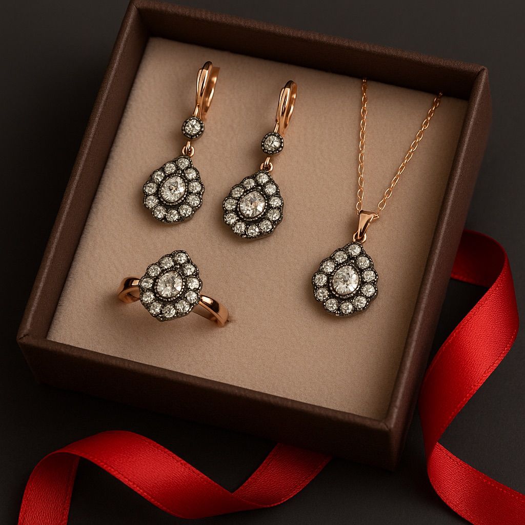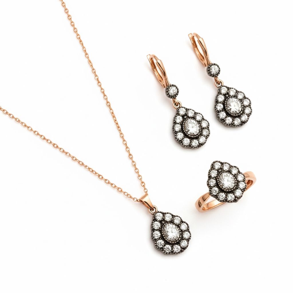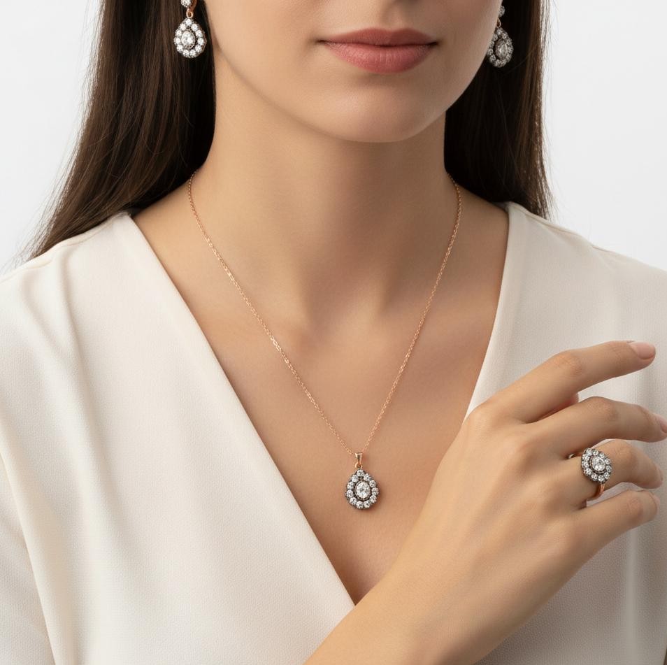 Bu eşsiz setin her bir parçası, yüksek kaliteli 925 ayar gümüş kullanılarak üretilmiştir. Gümüş metalin şıklığı, elmas montürlü damla taşlarla bir araya geldiğinde, ortaya çok özel bir estetik çıkmaktadır. Damla şeklindeki taşlar, ışık altında parlarken etrafa zarif bir ışıltı saçar. Gümüş yüzeyindeki ince işçilik detayları, setin hem kaliteli hem de gösterişli görünmesini sağlar.