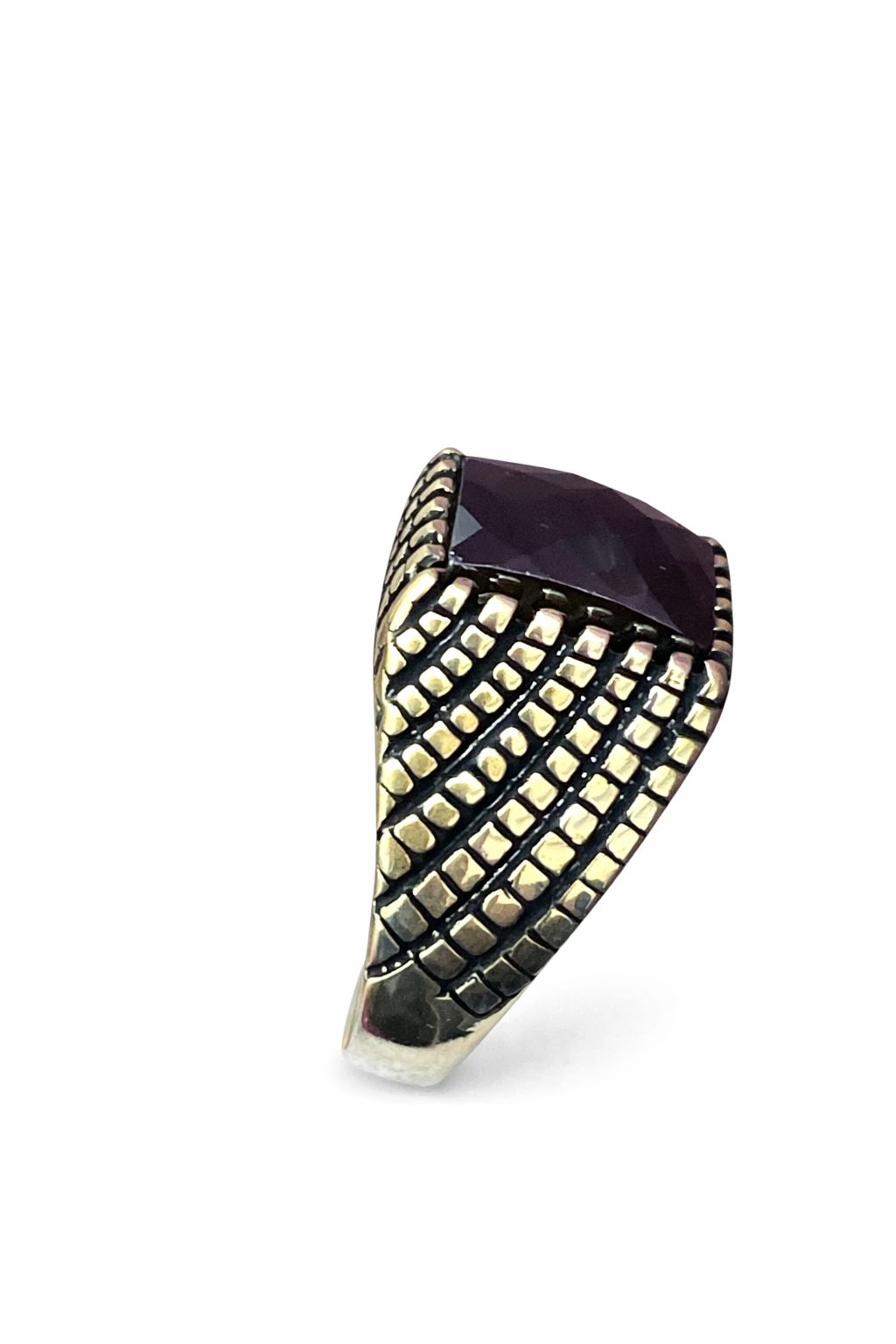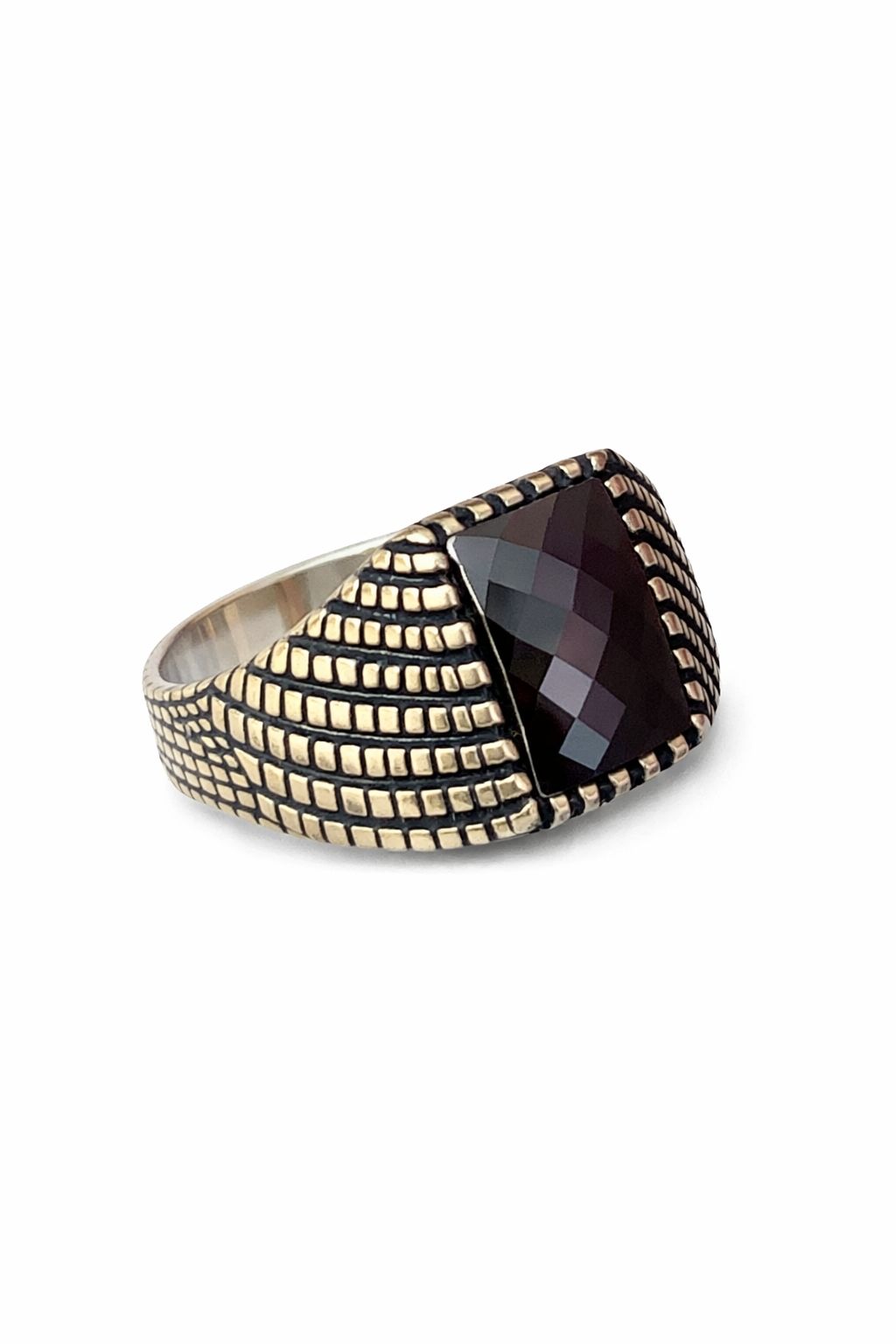 Bu yüzük, kaliteli 925 ayar gümüşten üretilmiştir, bu sayede hem dayanıklı hem de hafif bir yapıya sahiptir. Yüzüğün en dikkat çekici özelliği, faset kesim oniks taşıdır. Bu özel taş, göz alıcı parlaklığı ve derin siyah rengi ile dikkat çekerken, üst yüzeydeki faset kesimler sayesinde ışığı farklı açılardan yansıtır. Bu da yüzüğe eşsiz bir zarafet katmaktadır.