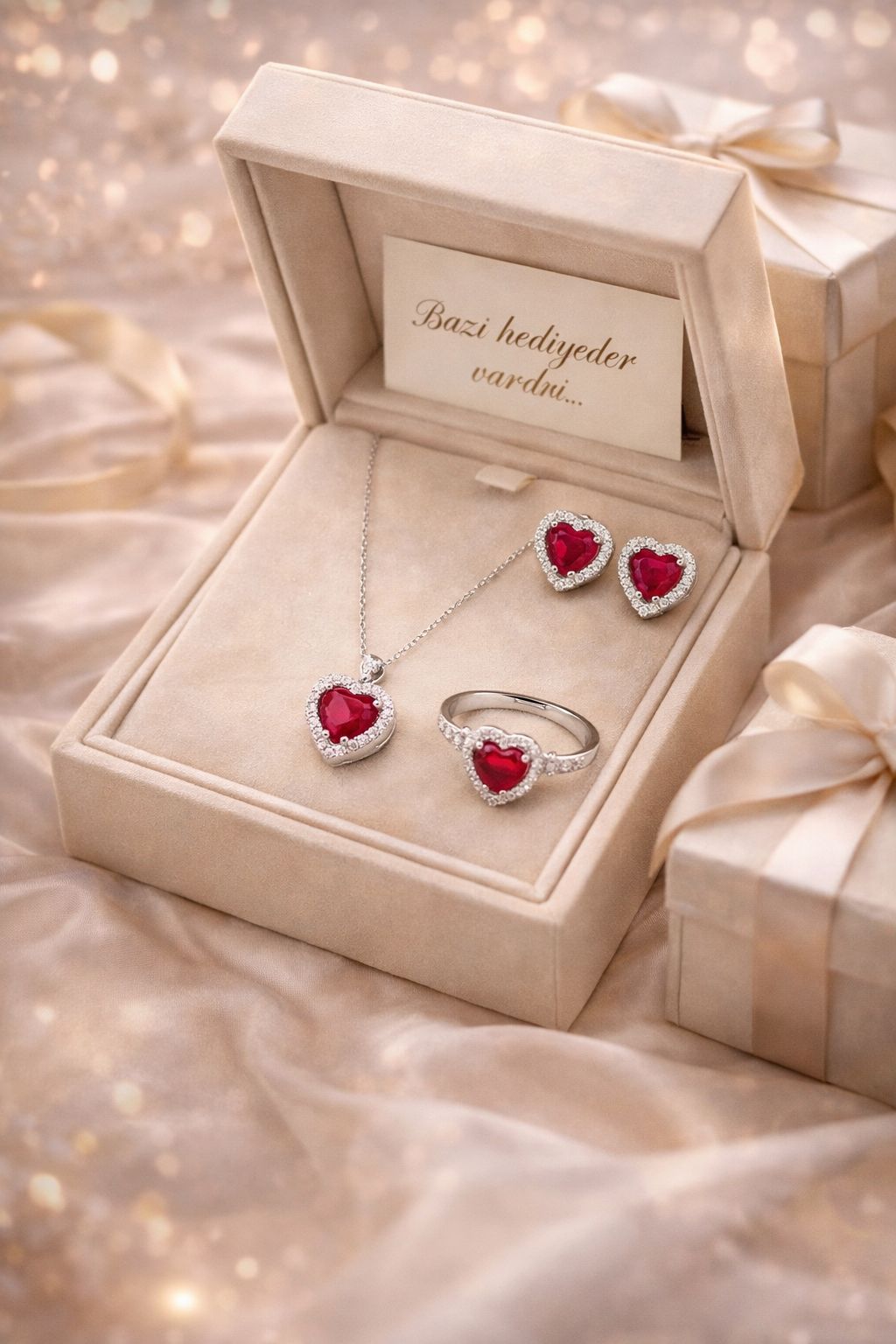 Kalbimin Işıltısı – Kırmızı Kalp Gümüş Takı Seti
