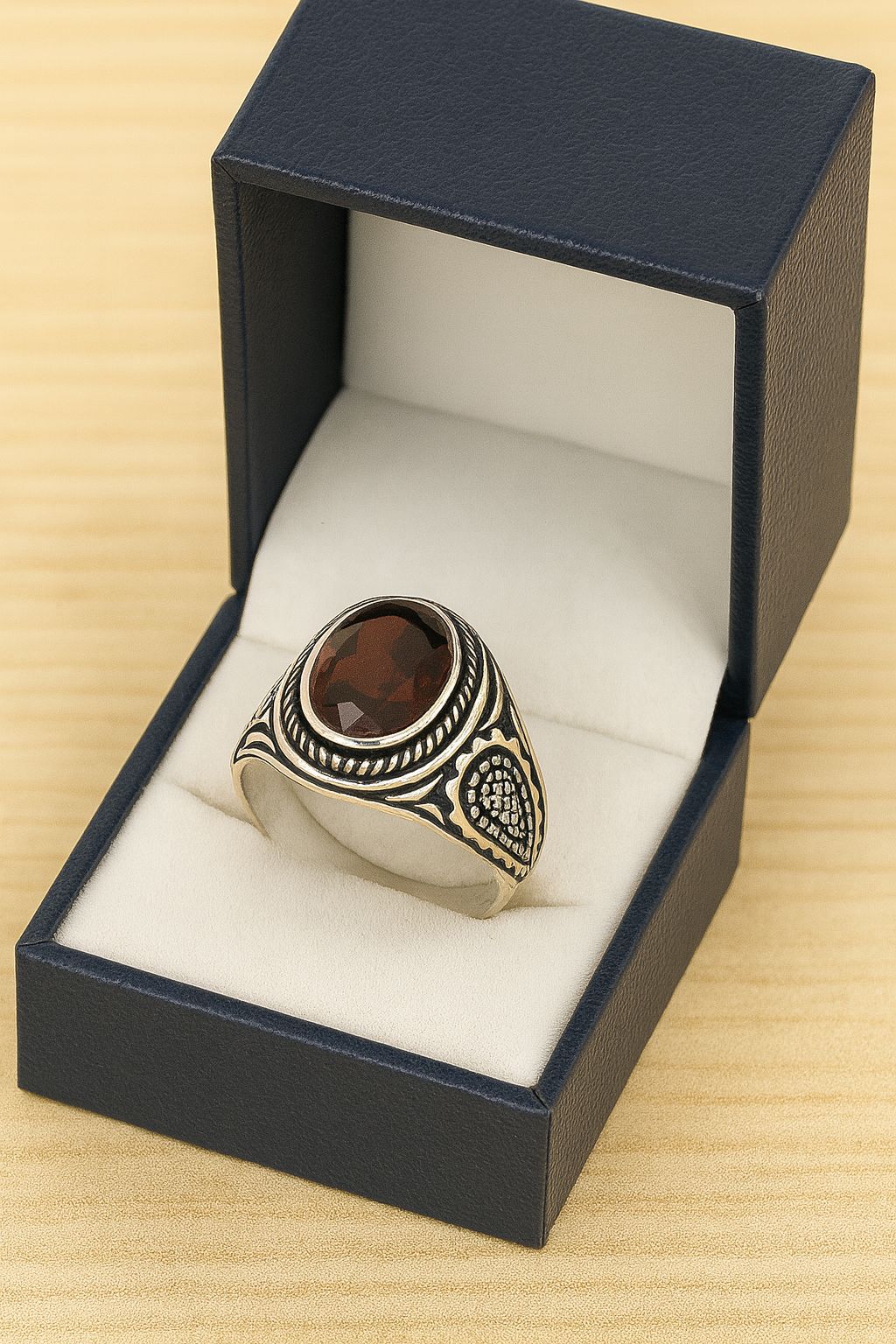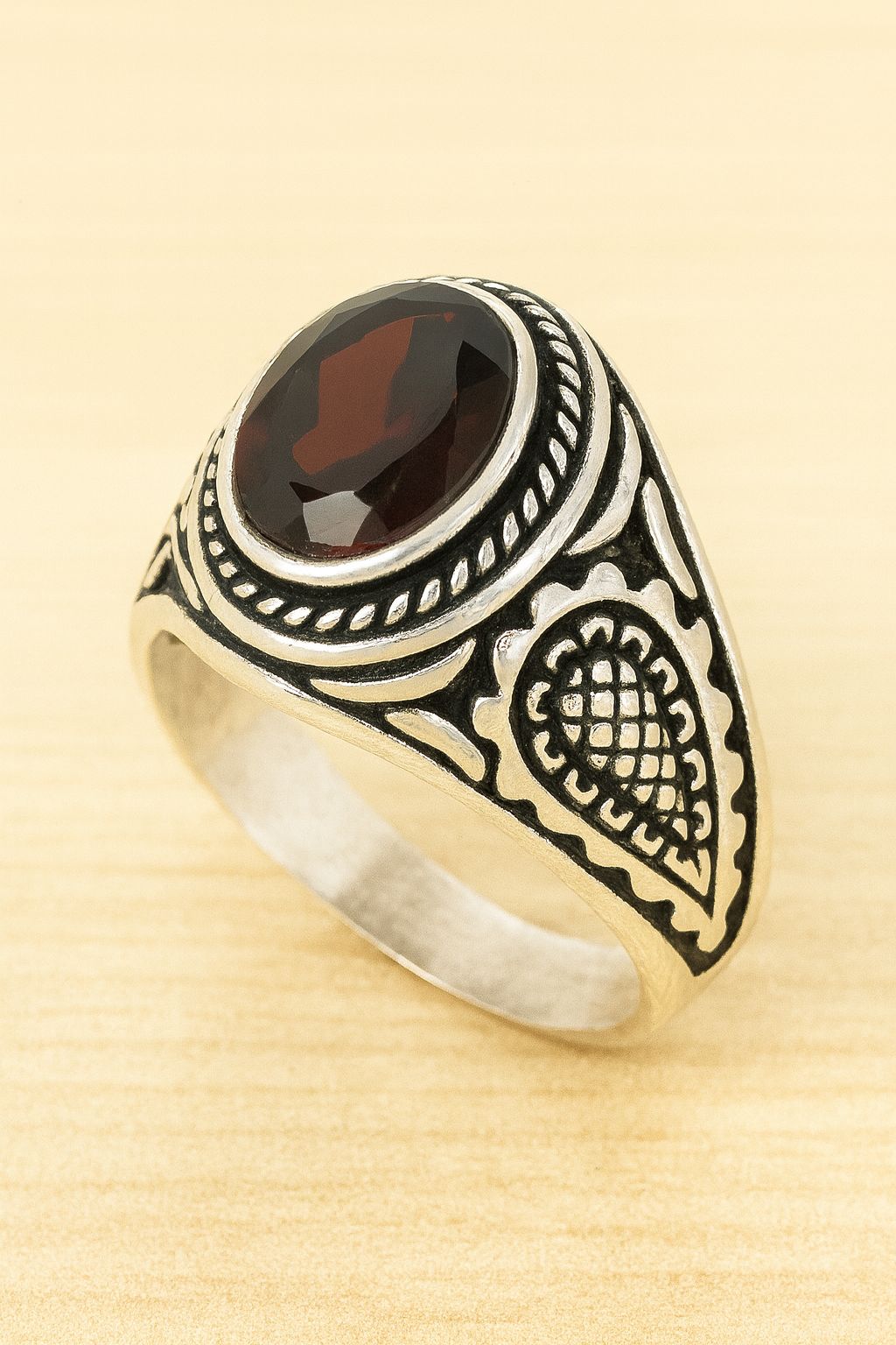 Yüzüğün temel malzemesi, yüksek kaliteli antik gümüş. Antik gümüş, klasik ve vintage bir görünüm sunarak, yüzüğün üzerindeki Lal granat taşının güzelliğini ön plana çıkarıyor. Yüzüğün tasarımı, detaylarda saklı olan zarafetiyle öne çıkıyor. Sade ama şık bir formda tasarlanmış olan bu yüzük, her erkeğin parmaklarında ayrı bir hava yaratacak.
