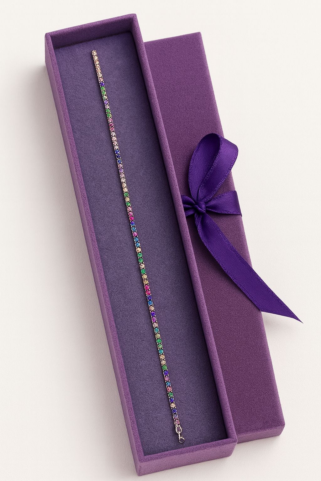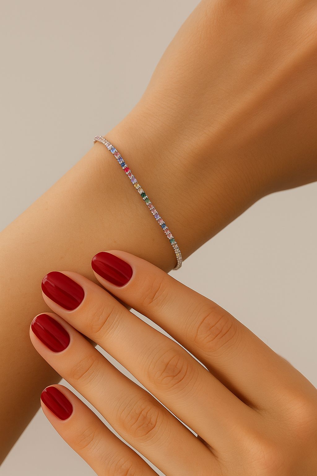 Renkli Taşlı Su Yolu Bileklik, diğer bileziklerle kombinlenerek katmanlı bir görünüm elde etmek için idealdir. Aynı zamanda tek başına kullanıldığında da dikkat çekici bir aksesuar olarak öne çıkar. Bileklik her türlü kıyafet ile uyum sağlayacak şekilde tasarlanmıştır. Gündüz ofis şıklığı için klasik bir bluz ile, gece davetlerinde ise şık bir elbiseyle uyum sağlar.