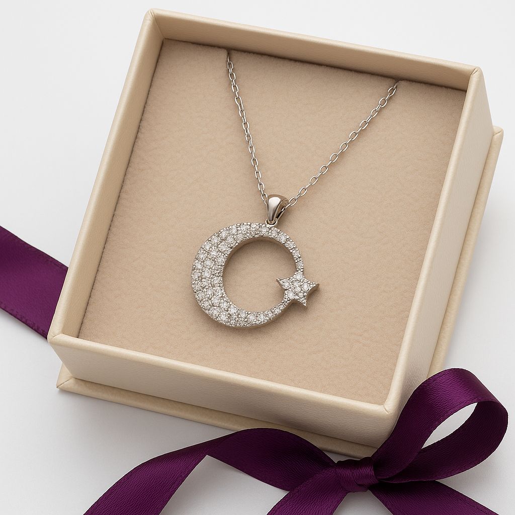 Bu göz alıcı kolye, klasik ay yıldız sembolünü modern bir dokunuşla yorumlamaktadır. Ay formu, zarif kıvrımlarıyla gümüş yüzeyde dans ederken, yıldız figürü parıltılı zirkon taşlarıyla süslenmiştir. Her bir zirkon taşı, ışığın altında farklı açılarda parlayarak, kolyenin genel ışıltısına katkıda bulunmaktadır. 925 ayar gümüş malzeme, hem dayanıklılığı hem de alerji yapmama özelliği ile öne çıkarak rahat bir kullanım sağlamaktadır.